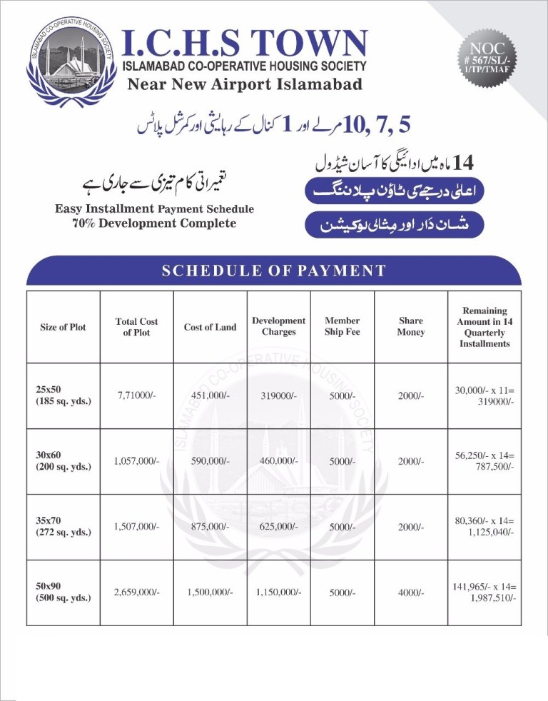 ICHS Town, located within the vicinity of the New Islamabad International Airport, offers a fully-facilitated and relaxing living experience amidst the peaceful backdrop of Islamabad. It is spread over 1500 kanal and specifically designed to facilitate middle-class families who prefer a high-quality lifestyle. The developer is fully aware of the advantages of this beautiful location and highlights it in the advertising campaign. The proximity to the new airport, and also to State Life Society and Sawan Garden, is great for its future prospects.